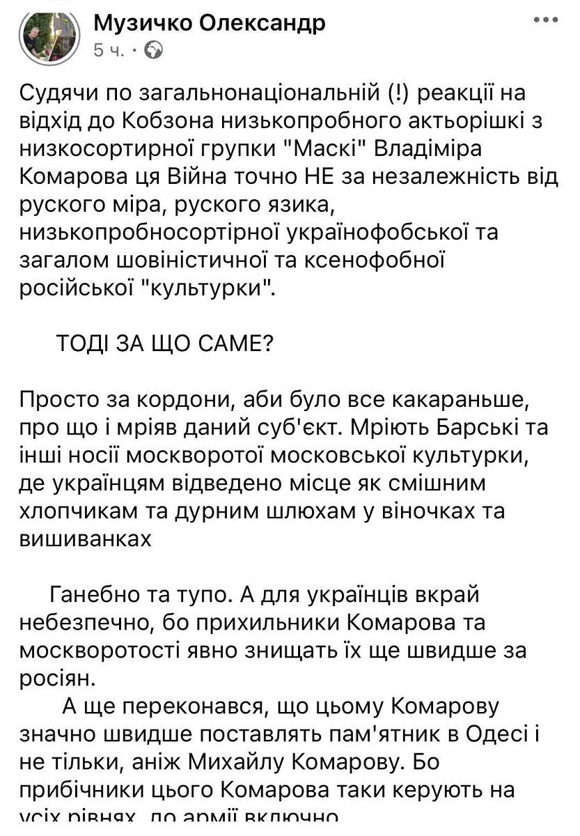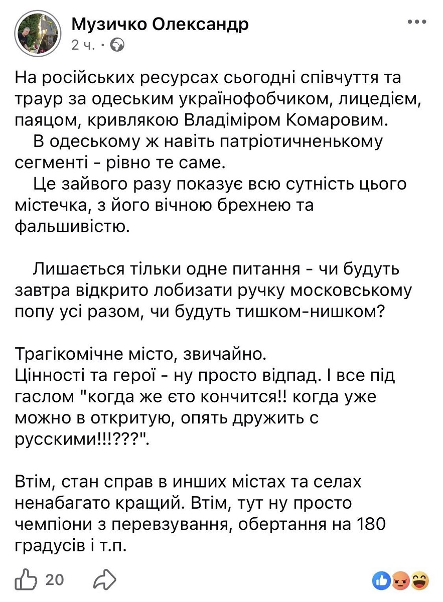 "Трагікомічне місто. Цінності та герої — просто відпад", — написав професор. Пост був опублікований у Facebook. Нині профіль Музичка закритий.