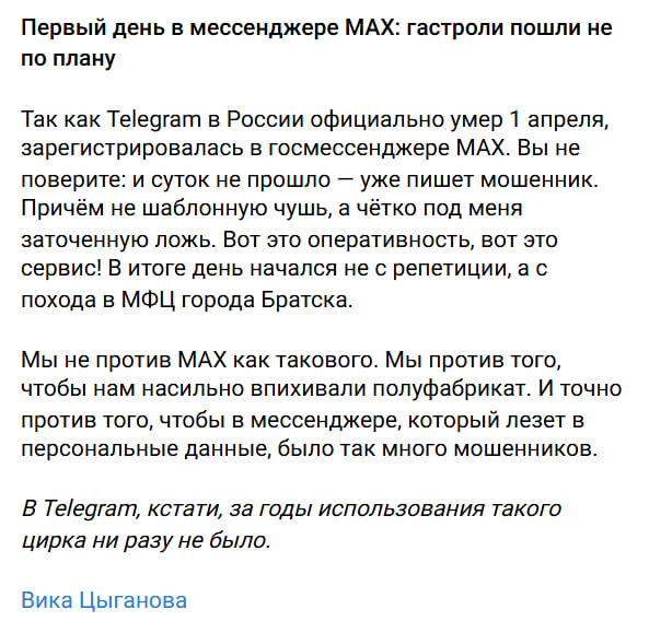 Наприкінці Циганова написала, що не проти самого месенджера MAX, проте їй нібито не подобається те, що росіян силоміць намагаються примусити користуватися "напівфабрикатом". Вона додала, що у Telegram такого з нею упродовж років користування подібних випадків не траплялося.