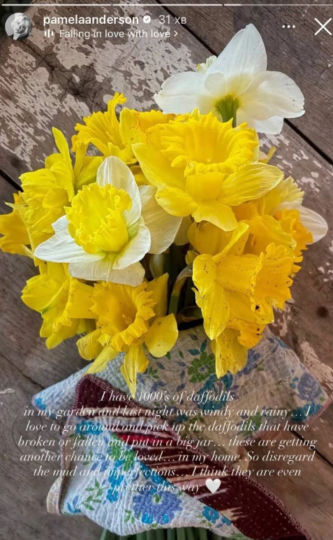 "У мене в саду тисячі нарцисів, а вчора ввечері було вітряно і дощово… люблю збирати зламані або ті, що впали, нарциси та складати їх у велику вазу… таким чином, вони отримують ще один шанс бути коханими… у мене вдома. Тож не зважайте на бруд та недоліки… мені здається, так вони навіть красивіші", — написала Памела.