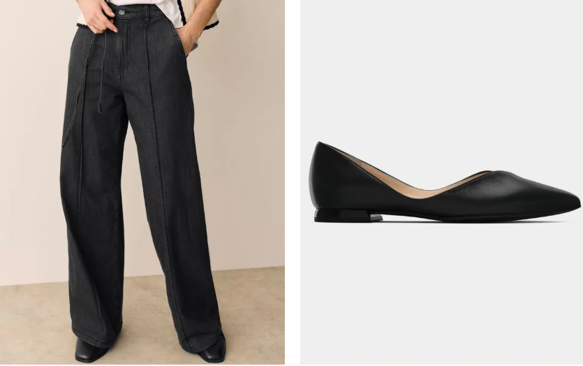 Гра пропорцій робить цей дует особливо ефектним. Об’ємні штани контрастують із витонченими гострими балетками, що візуально подовжують силует і додають образу сучасності.