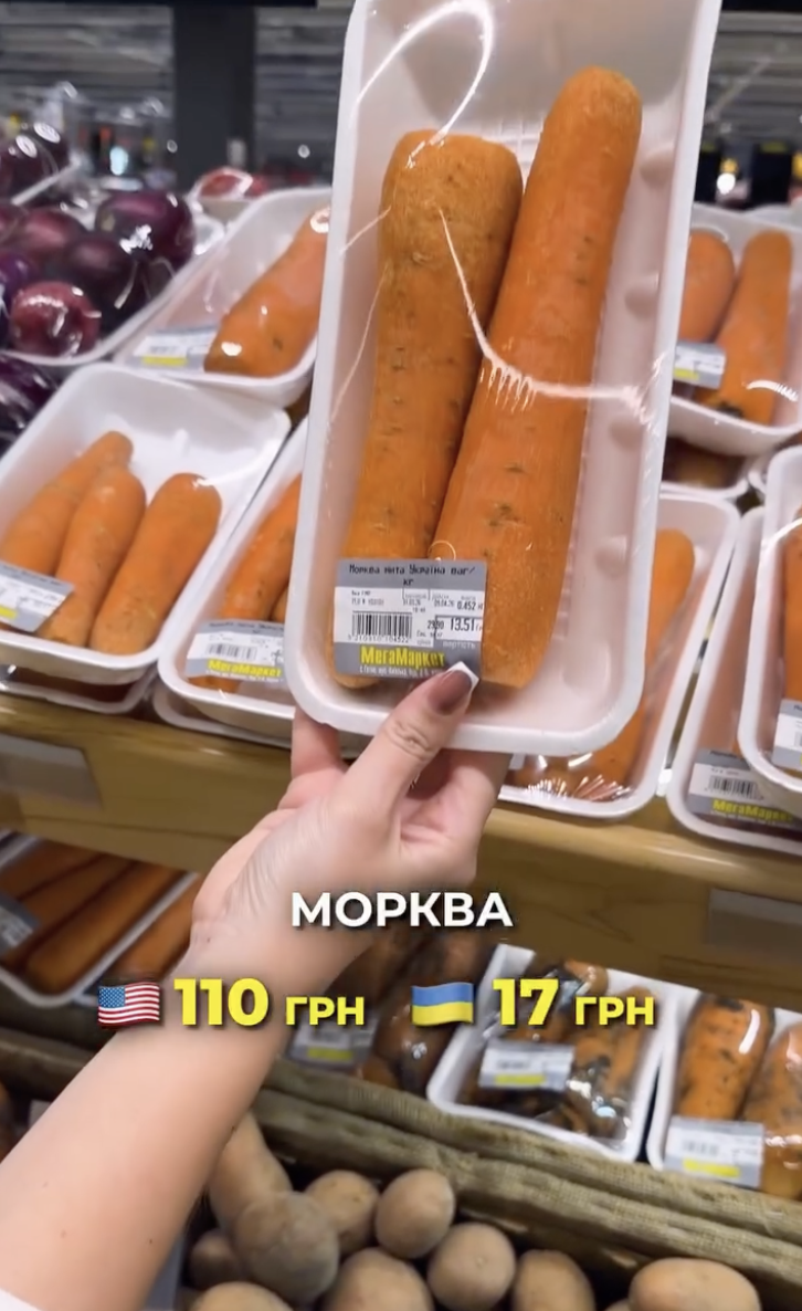 "А тепер овочі. І тут Україна виграє без всяких шансів. Морква у нас в 10 разів дешевша (110 грн в США, 17 грн в Україні), а картопля — майже в 3 (87 грн і 24 грн)", — каже авторка відео.