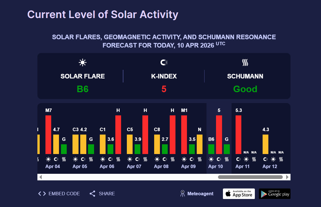 Як йдеться на порталі Meteoagent, 10 квітня зафіксовано різке посилення геомагнітної активності — рівень бурі зріс до 5 балів. До цього протягом останнього періоду спостерігалася відносно спокійна ситуація з показниками на рівні 2–3 балів. Прогнозується, що протягом наступної доби активність залишатиметься високою, після чого 12 квітня розпочнеться поступове зниження інтенсивності. Зокрема, вже в неділю очікується спад до рівня близько 4 балів.