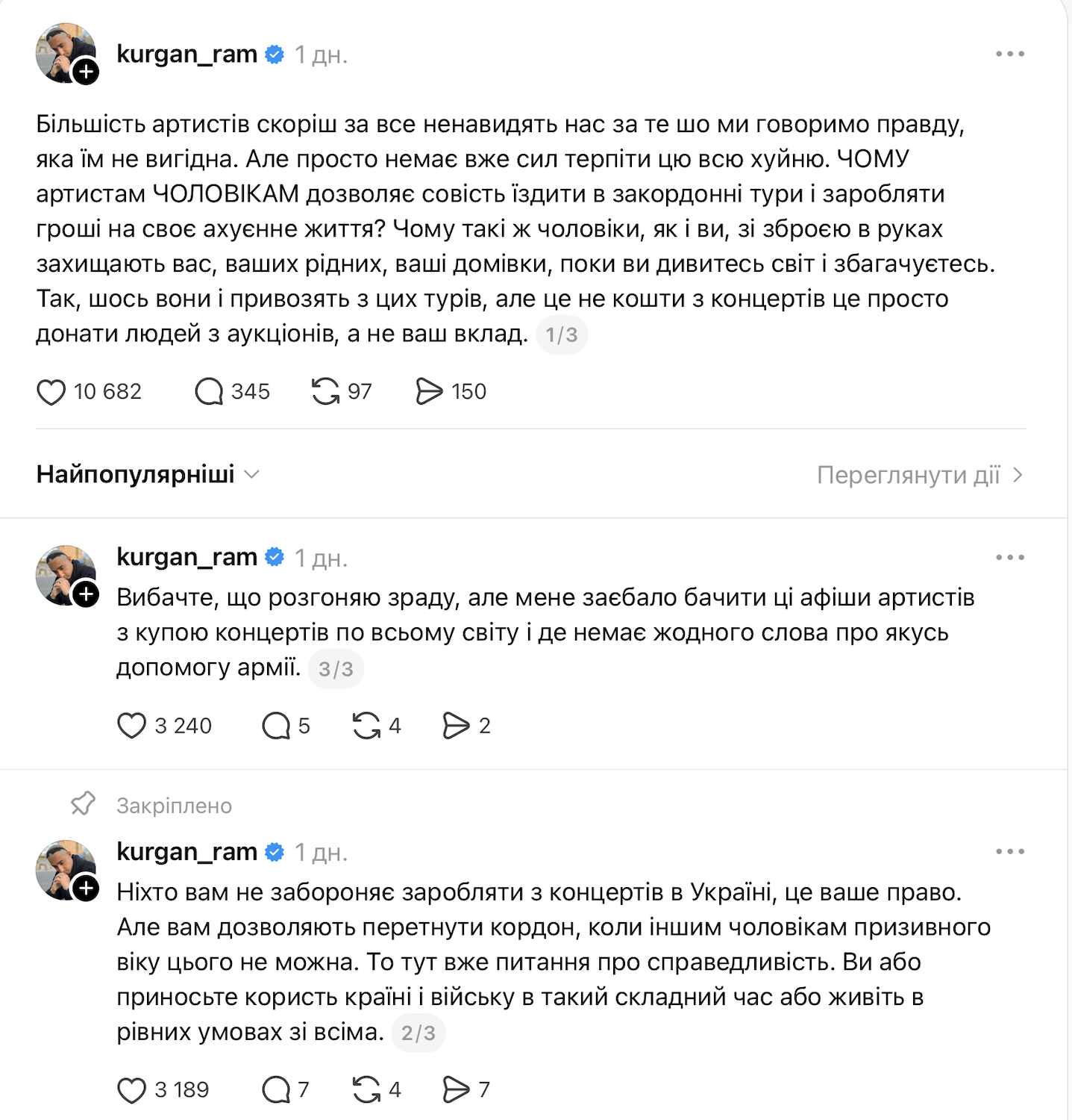 У дописі в Threads Насіров заявив, що більшість артистів "ненавидять" тих, хто говорить незручну правду, але суспільство більше не готове це терпіти. За його словами, чоловіки-артисти продовжують гастролювати за кордоном і заробляти кошти, тоді як інші чоловіки зі зброєю захищають країну, їхні родини та домівки.