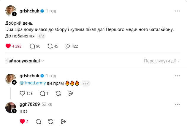"Добрий день. Dua Lipa долучилася до збору і купила пікап для Першого медичного батальйону. До побачення", — повідомив народний депутат Роман Грищук.