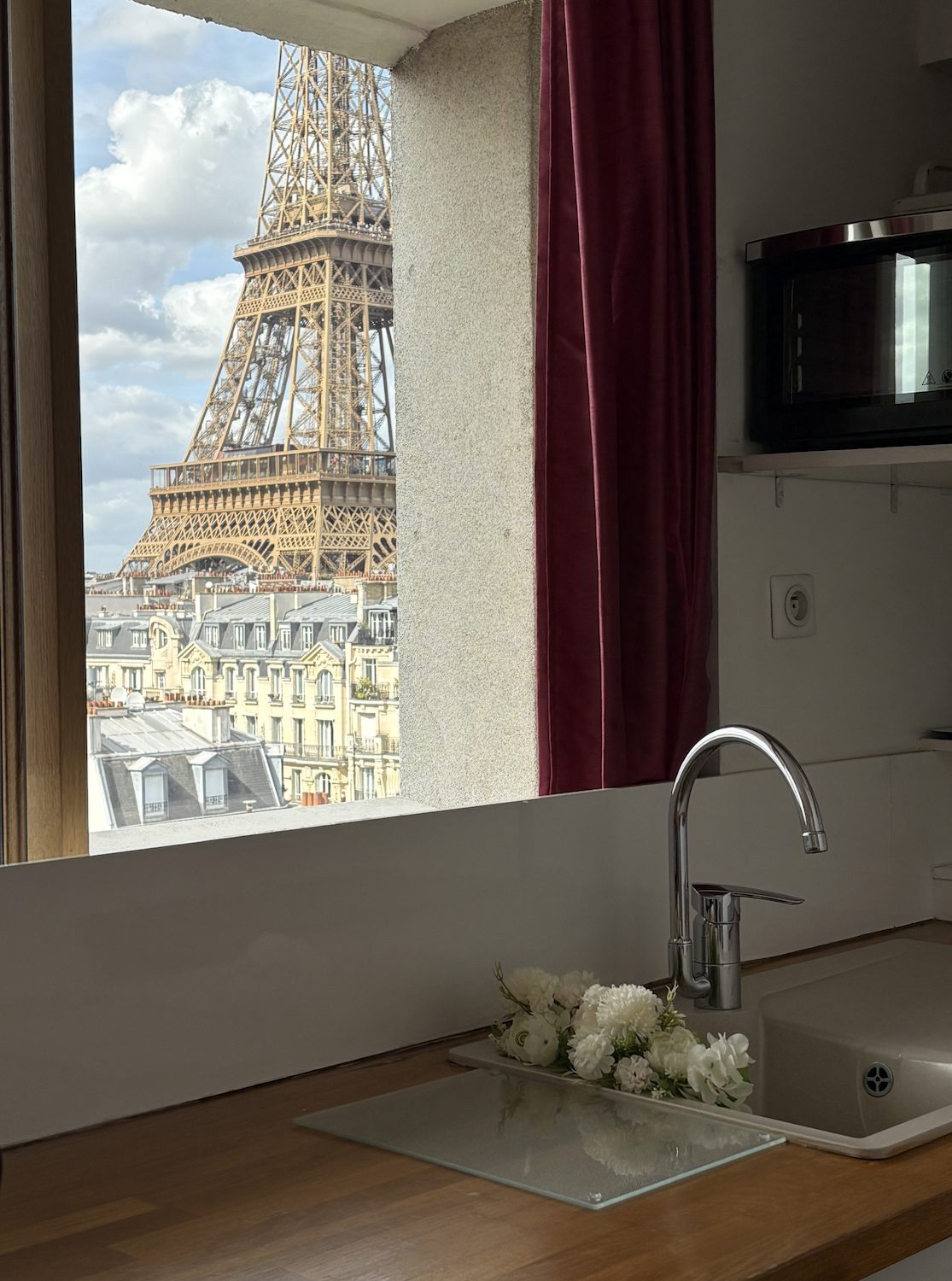 Житло розташоване у 15-му окрузі, який прилягає до 7-го округу, що вважається одним із найбільш престижних у місті. Саме це і забезпечує вражаючий вид на знакову пам’ятку.