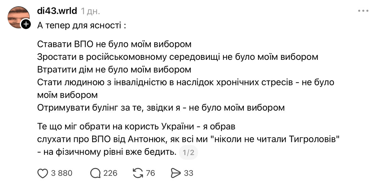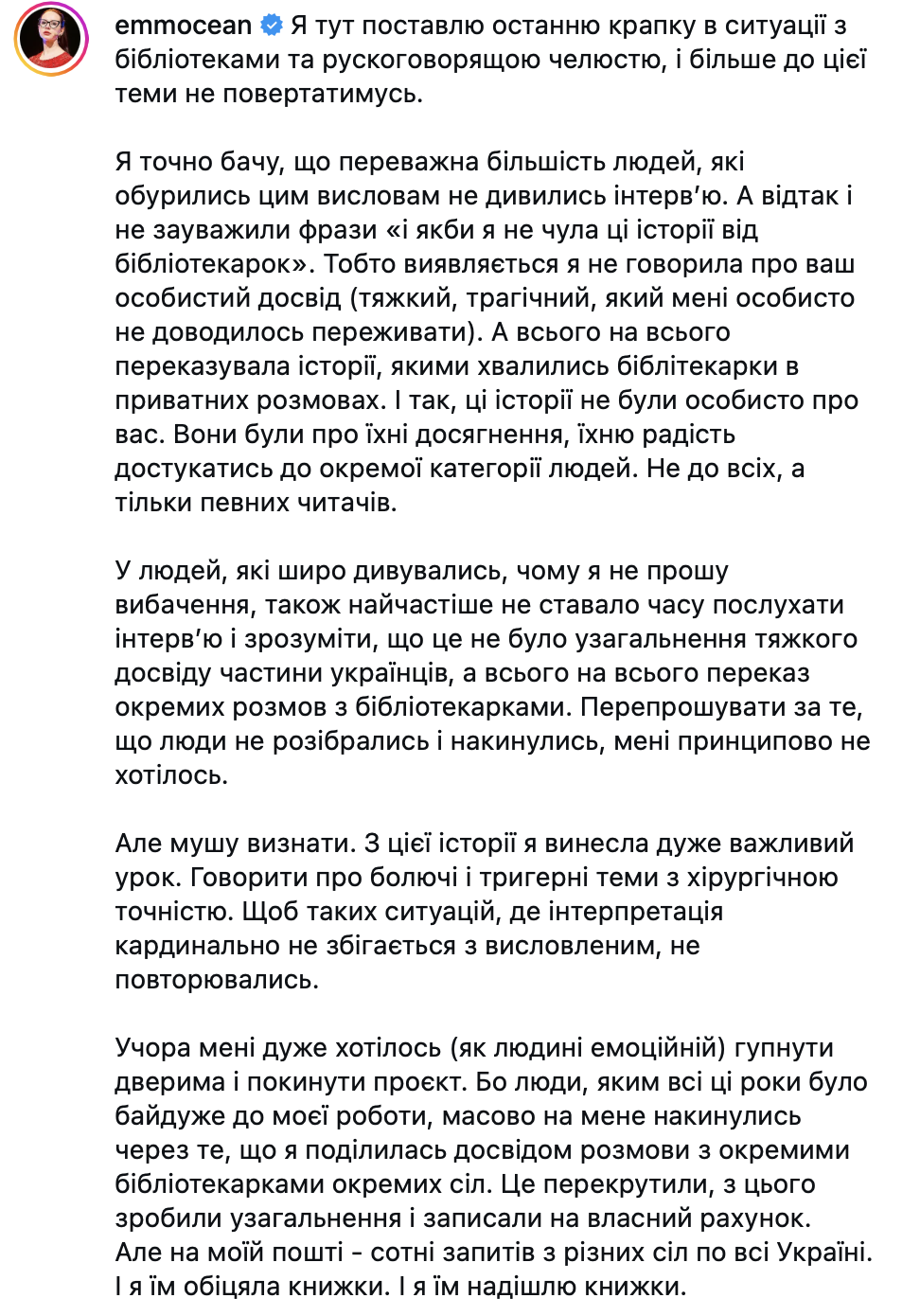 Вона окремо підкреслила, що не вважає за потрібне вибачатися: "Перепрошувати за те, що люди не розібрались і накинулись, мені принципово не хотілось". Водночас блогерка визнала, що зробила висновки щодо комунікації: "Говорити про болючі теми треба з хірургічною точністю".