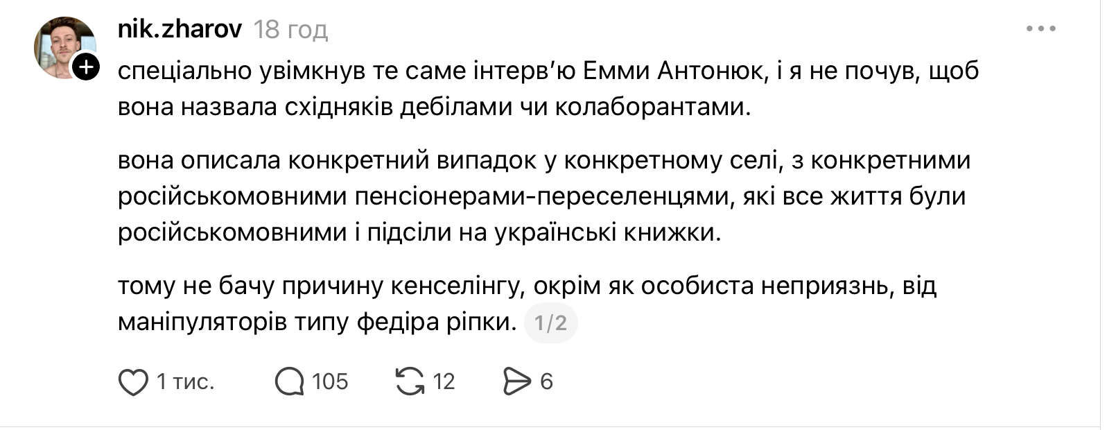 Скандал навколо висловлювань інтерв’юерки та блогерки Емми Антонюк переріс у широку дискусію про мову, досвід сходу України та межі узагальнень. Після хвилі критики вона заявила, що її слова вирвали з контексту, і відмовилась перепрошувати, пояснивши свою позицію.