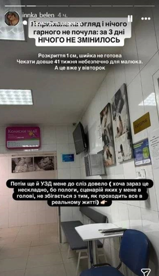 "Я пройшла огляд і нічого гарного не почула: за 3 дні нічого не змінилося. Розкриття 1 см, шийка не готова. Чекати довше 41 тижня небезпечно для малюка, а це вже у вівторок", — розповідає блогерка в своєму Instagram.