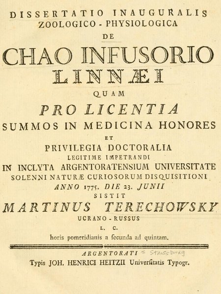 Відповідно, назва дисертації Тереховського звучить для нашого вуха трохи дикувато, але красиво: "Про наливковий хаос Ліннея". Або мовою оригіналу: "De chao infusorio Linnaei" (1775).