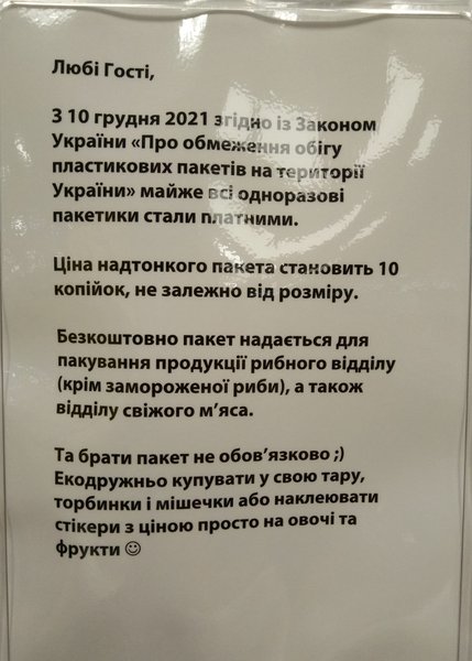 Зайшов у київські магазини у вихідні. Усе, що змінилося в плані пластикових пакетів, — вони стали платними. На тих самих місцях і в колишньому асортименті. Поки що все скорочення поліетиленових відходів у тому, що рибу чи м'ясо вантажать не в два пакети, а один. Стрічки на касах і сумки тепер у підтьоках.