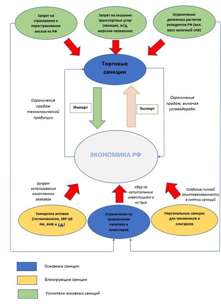 До основних санкцій я додав би торгові санкції та обмеження на залучення капіталу. Торгові санкції мають на меті перекрити потоки виторгу, зокрема від продажу вуглеводнів. Обмеження на залучення капіталу спрямовані на скорочення капітальних інвестицій та зазвичай їх супроводжує удар по завезенню в країну високих технологій, які приходять в економіку разом із прямими інвестиціями.