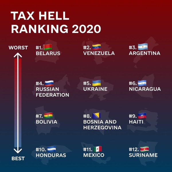 Також (важливо — за даними 2020 року!) ми були на 5 місці серед країн з рейтингу "Податкового пекла" — Tax Hells. Цей рейтинг не скільки про самі ставки податків, скільки про мікс інфляції, корупції, ставок, якості держуправління, рівня державного боргу, передбачуваності регуляторного поля тощо.