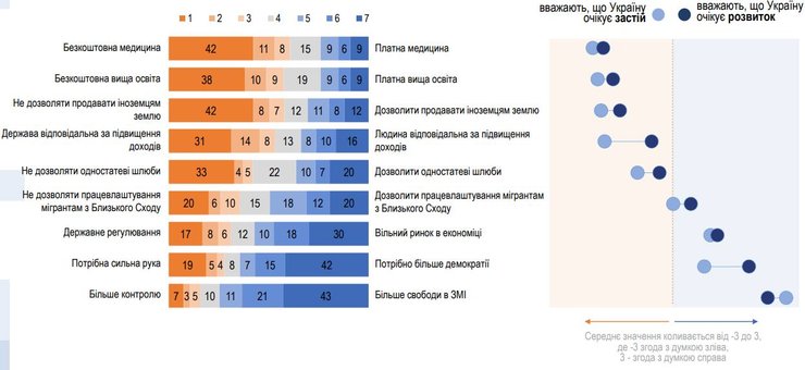 Тішить, що серед усіх опитаних є вирішальна перевага на користь свободи ЗМІ, демократії та вільного ринку. Тішить, що уже всього третина населення різко не підтримує одностаттеві шлюби. Засмучує, що близько половини досі проти продажу землі іноземцям, але під час війни це зрозуміло — відчуття небезпеки тисне на сприйняття.
