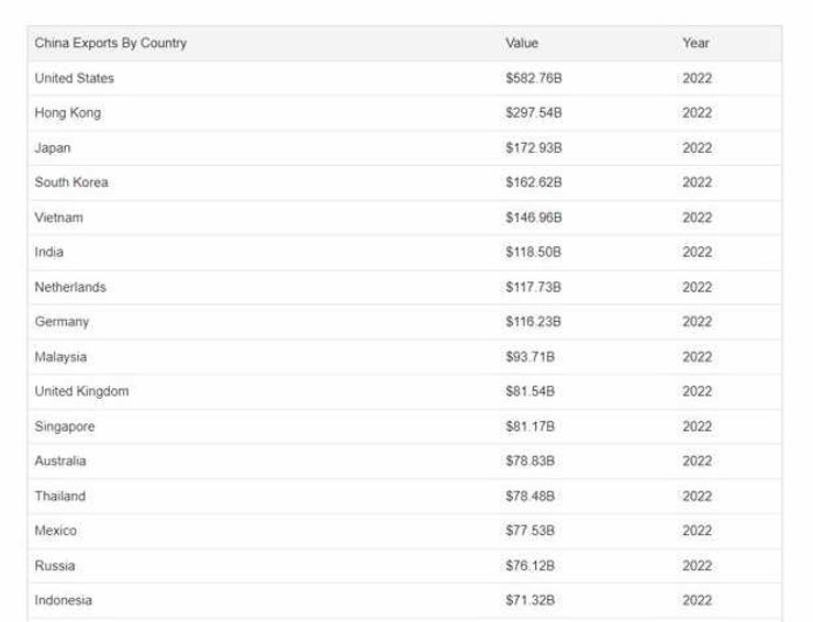 Торговий реципієнт №1 експорту з КНР — Європейський союз: на країни ЄС у 2022 році припадало експорту з КНР приблизно на 980 млрд доларів (856,3 млрд євро). Другий партнер — це США з 583 млрд доларів, далі Японія — 173 млрд. Не менш цікавий і Гонконг (298 млрд), який є країною-посередником. На тлі цих вовкодавів РФ, зі своїми 76 млрд доларів експорту і залежністю від бажання КНР купувати чи ні у РФ нафту і газ, виглядає дуже мляво.