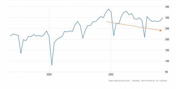 До того, що "дід божевільний", звикли всі, а дарма. Гостра зміна лінії поведінки Путіна на прийомі у свого китайського господаря не тільки логічна і пояснюється цифрами, а і єдино можлива. Річ у тому, що КНР відчуває поступовий спад власного експорту (див. графік).