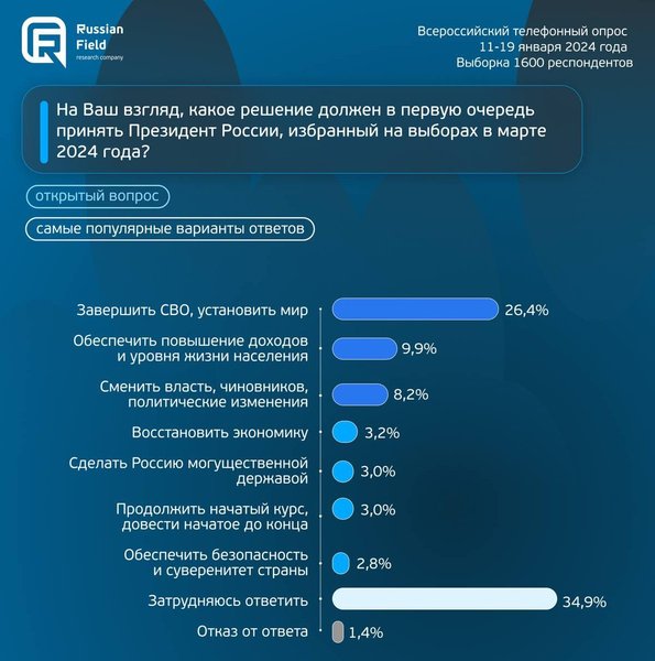 Тут ви можете переконатися, що більшість росіян, ще здатних мислити (26,4%), уже наїлися війни досхочу і прагнуть якнайшвидшого миру. За війну до перемоги сукупно менше 10%. "РусіанФілд" — це нормальна контора, вона не підтасовує результати.