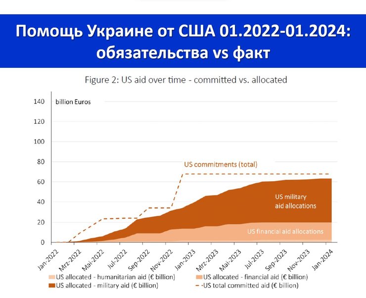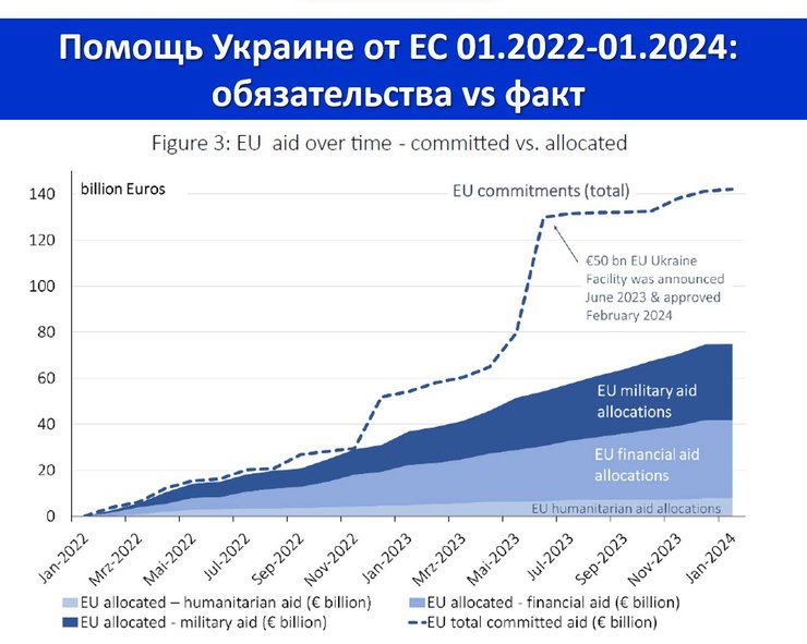Станом на 15.01.2024 р. зобов'язання ЄС щодо допомоги Україні становили 144 млрд євро. Фактично виділено допомоги на 77,21 млрд євро. Між зобов'язаннями і фактом утворився великий розрив, ~50% суми зобов'язань. З лютого 2022 року Європа послідовно випереджала США за обсягом виділених ресурсів. Станом на 15.01.2024 р. виділена допомога Європи (країни та організації) склала 88,7 млрд. Для порівняння: США виділили 66,1 млрд євро (~ на 25% менше). Водночас США поки що попереду за виділеною військовою допомогою. Америка виділила військової допомоги на 43,2 млрд євро, на 2 млрд євро більше, ніж європейські країни.