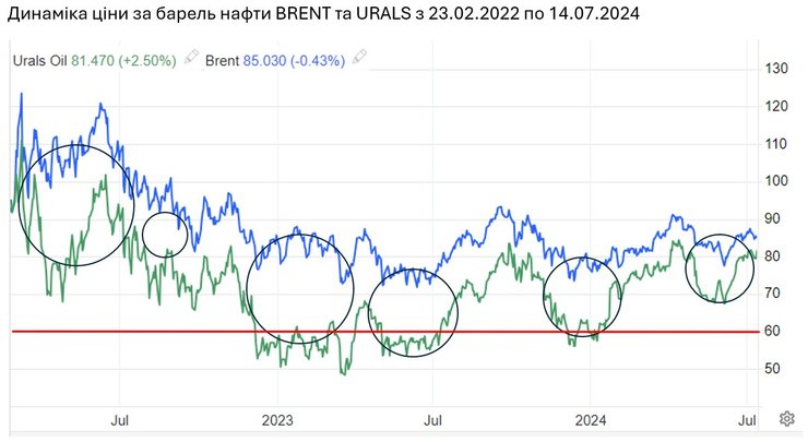 Якщо подивитись на графік цін BRENT та URALS, то можна відразу помітити дію санкцій. Від початку війни було щонайменше 6 періодів, коли порушувалась кореляція між цінами BRENT та URALS, а дисконт між ними суттєво зростав. Втім кожного разу росіяни за 3-4 місяці швидко адаптувались до санкцій, і ринок вже у 2024 році рухався вище цінового максимуму, який встановлений для російської нафти міжнародними партнерами України на рівні 60 доларів за барель (див. графік).
