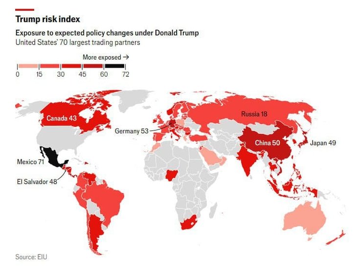 Вкрай негативно прихід Трампа відіб'ється на Китаї (нова торгова війна), РФ (можливе зниження цін на нафту), Індії (згортання програми американських інвестицій і передання технологій), Туреччині (як і Мексика — модель ніаршорингу), Саудівській Аравії (ціни на нафту), ПАР (ліквідація торговельних пільг).
