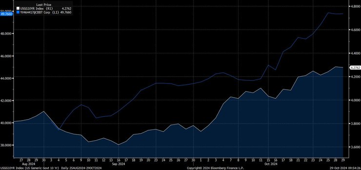 Протягом останніх двох місяців процентні ставки (на графіку білим кольором, права шкала) стабільно зростають, а дохідності 10-річних казначейських облігацій США сягнули майже 4,3% порівняно з 3,8% у вересні. Обидва кандидати обіцяють значні зміни для своїх виборців. Але програми Трампа щодо зниження податків натякають на більший бюджетний дефіцит, а отже, зростання державного боргу. У зв'язку з цим, Мінфіну США, ймовірно, доведеться активніше залучати кошти на ринках, що підштовхує ставки до нових висот.