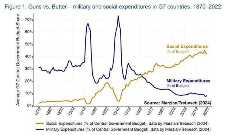 До Першої світової війни країни Заходу витрачали на соціалку взагалі менше 10%, зате на військові витрати йшло понад 30% бюджетних витрат. Тобто ці країни готувалися до війни.