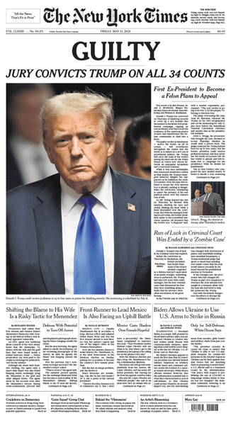 Байден може вважати себе справедливим тому, що відносно незначні судимості Гантера Байдена — за ухилення від сплати податків і брехню про вживання наркотиків під час купівлі зброї — люто використовували його політичні противники. Але в такому ж шаленому переслідуванні ділових проступків Трампа демократичною владою Нью-Йорка теж було політичне зерно. Перша шпальта New York Times стала бульварною і радісно кричала: "GUILTY".