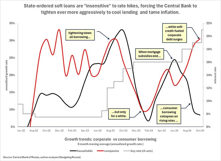 2) На відміну від оборонного бюджету, який підтримувався на стабільному рівні, позабюджетну схему фінансування оборони Росії стало набагато проблематичніше підтримувати протягом другої половини 2024 року; він зріс настільки, що спричиняє інфляцію, підвищуючи відсоткові ставки для позичальників із "реальної" економіки значно вище 21% і створюючи передумови для системної кредитної кризи. У другій половині 2024 року Центробанк Росії (ЦБР) почав визначати державну схему пільгового корпоративного кредитування як суттєву загрозу економічній стабільності Росії. Будучи головним джерелом монетарної експансії, він спричинив зростання інфляції в Росії. Що ще гірше, оскільки це кредитування має стратегічний, а не комерційний характер, Центробанк зазначає, що воно було значною мірою "нечутливим" до підвищення процентних ставок, притупляючи основний інструмент ЦБР для боротьби з інфляцією (див. Малюнок 4). Отже, щоб охолодити загальні запозичення, ЦБР каже, що він був змушений посилити набагато агресивніше, ніж це було б необхідно в іншому випадку.