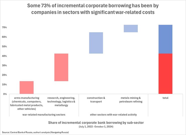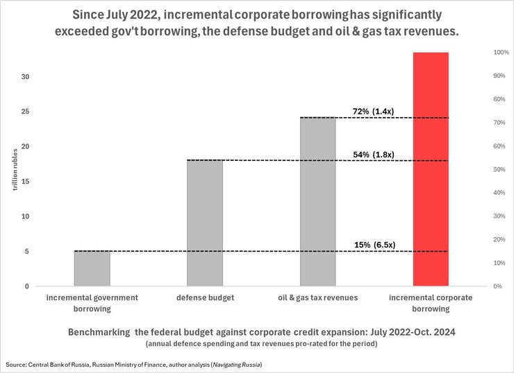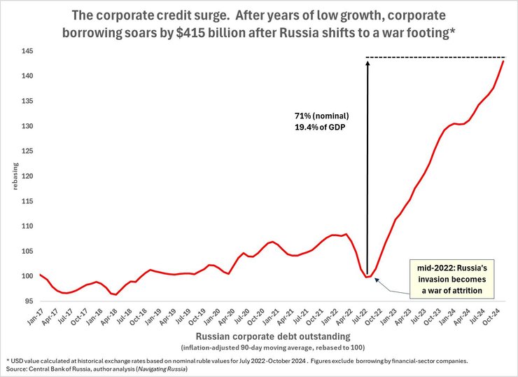 Коротше кажучи, загальні витрати Росії на війну значно перевищують офіційні бюджетні витрати. Держава непомітно фінансує приблизно половину цих витрат поза бюджетом шляхом значних боргів, змушуючи банки надавати кредити на "неринкових" (некомерційних) умовах підприємствам, які постачають товари та послуги для війни.