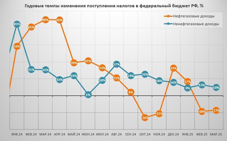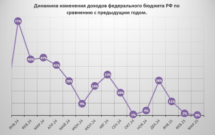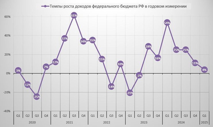 Темпи зростання доходів федерального бюджету за останні 5 кварталів скоротилися з +54% у 1 кварталі 24-го до +4% у 1 кварталі 25-го в річному вимірі.