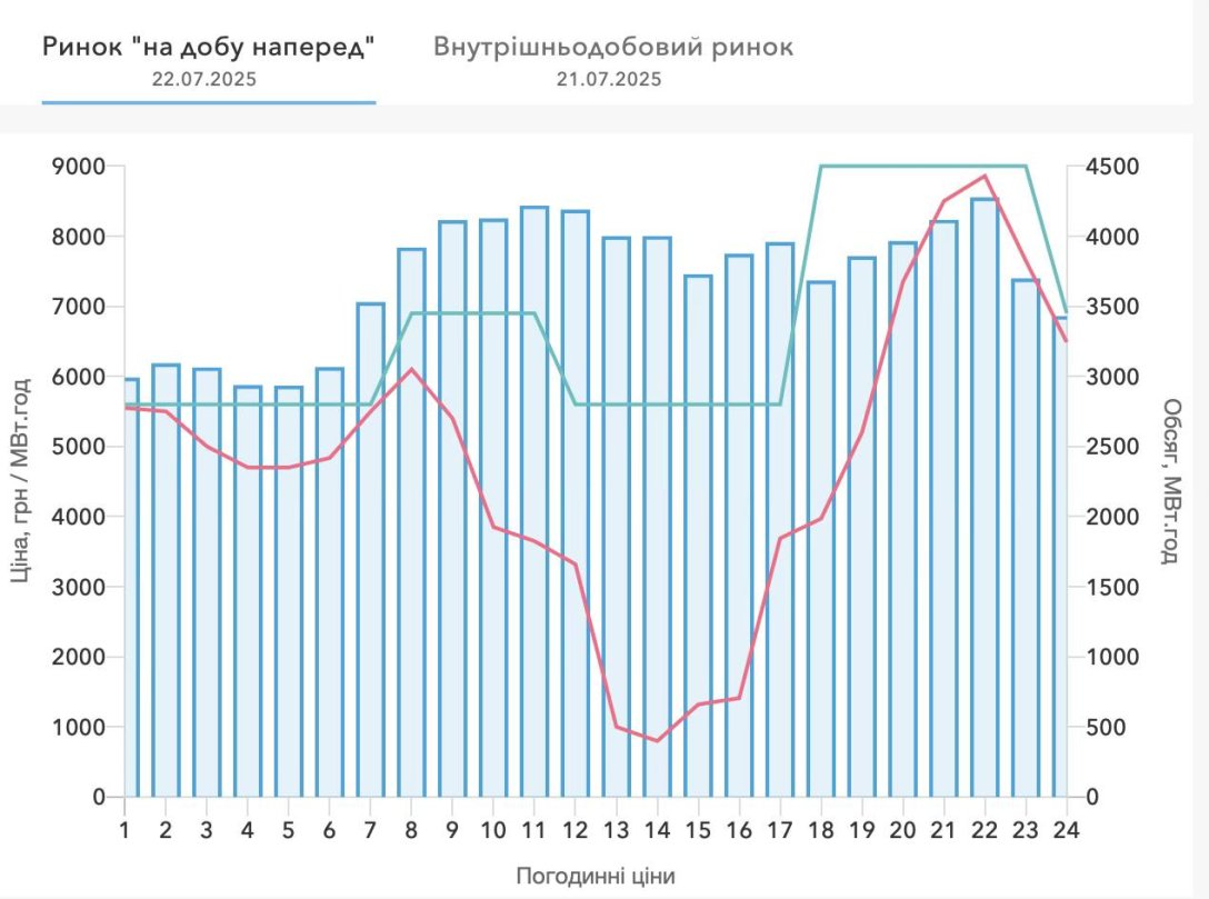 Але в нинішніх умовах говорити, що ціна зміниться пропорційно підвищенню прайс-кепів – маніпуляція. Достатньо подивитись графіки цін на РДН (ринок на добу наперед — Ф.) та ВДР (внутрішньодобовий ринок — Ф.), щоб зрозуміти, що підвищення прайс-кепів не потягне за собою таке ж зростання ціни – погодинні ціни зрідка сягали цінової стелі в останні тижні. От, наприклад, графік погодинних цін на РДН на 22.07 засвідчує це.