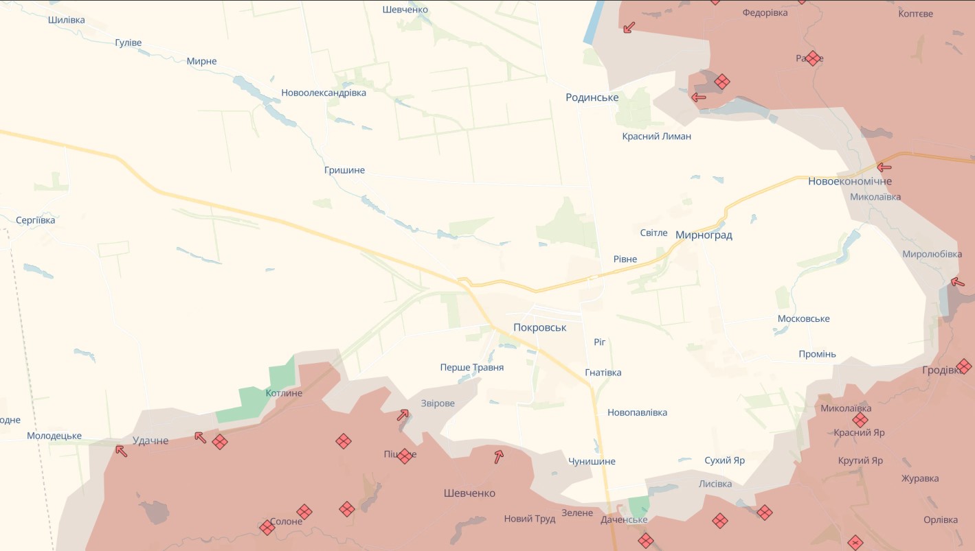 Від оперативного оточення Покровська та Мирнограда ЗСУ відокремлюють лише кілька ще не зайнятих противником населених пунктів, зазначає військовий кореспондент Богдан Мірошников. І тут вже треба думати про те, наскільки захищена траса на Павлоград...