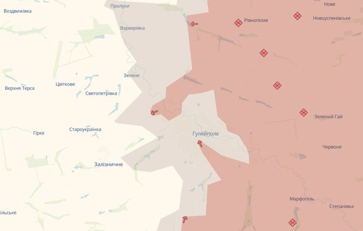 - Ворог зміг переправитися через річку Гайчур у смузі своєї 5-ї ЗВА одночасно на кількох ділянках, зокрема в межах міста Гуляйполе, і просунутися по напрямках, що збігаються — Марфопіль–Гуляйполе, Зелений Гай–Гуляйполе та Рівнопіль–Гуляйполе, фактично зайнявши значну частину міста і "інфільрувавши" свої штурмові групи вже НА ЗАХІД від нього, у напрямку Залізничного та Староукраїнки. Наразі його передові підрозділи, форсувавши річку Гайчур, досить впевнено закріпилися в північній частині Гуляйполя (поблизу середньої школи No2), а також дісталися до району Центрального кладовища міста, діючи вздовж дороги з боку Марфопіля. Насправді російські війська вже завершують бої за центральну частину Гуляйполя і дуже близькі до захоплення всього міста.