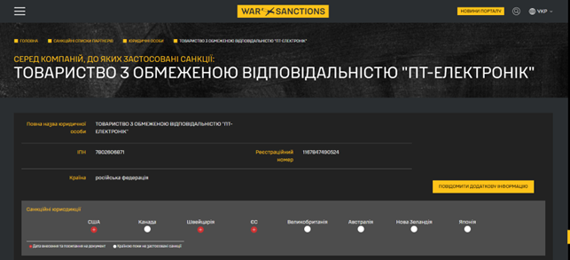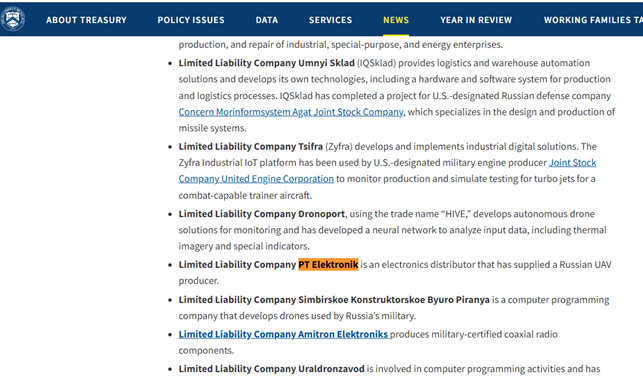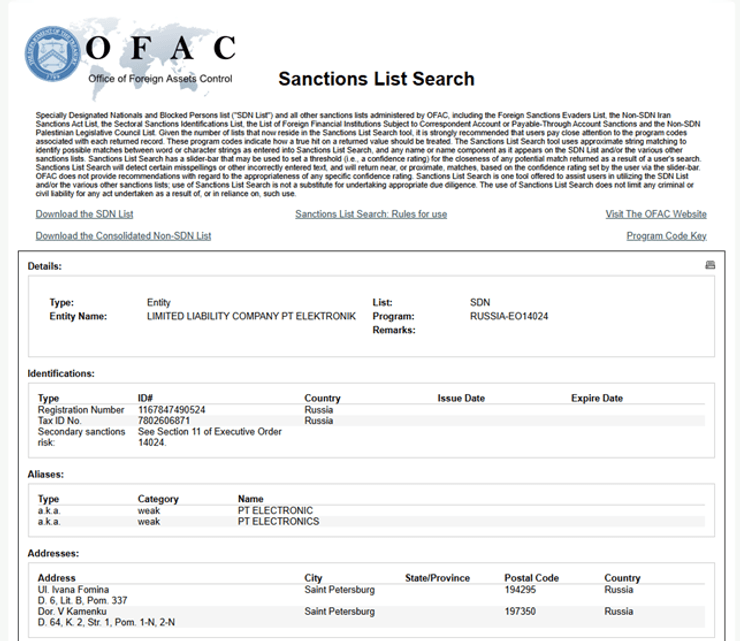Тому OFAC внесло LIMITED LIABILITY COMPANY PT ELEKTRONIK до списку SDN.