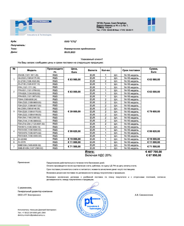 У розслідуванні міжнародної розвідувальної спільноти InformNapalm наводяться викриті дані OSINT-дослідників та злите листування російського виробника БПЛА «Орлан-10» «Спеціального технологічного центру» (СТЦ), які свідчать про те, що саме «ПТ Електронік» Шуміліна у 2023 році виступала ключовим посередником у контрабандних поставках німецького обладнання Rohde & Schwarz для потреб ВПК агресора. Наприклад, мова про аналізатори спектру – критично важливі компоненти, без яких неможливо зібрати та експлуатувати російські РЛС та комплекси РЕБ «Леєр-3», про контролери польоту та модулі GPS для «Орланів» та інше.