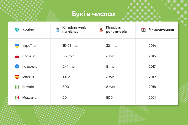 Компанія працює з 2014 року. Менше ніж за 7 років Букі досягла великих успіхів у галузі EdTech та стала міжнародною компанією, яка має власну базу учнів і викладачів у 6 країнах світу, а саме: Україні, Польщі, Казахстані, Іспанії, Нігерії та Мексиці. Загальна кількість клієнтів становить приблизно 137 738 на рік, а кількість зареєстрованих викладачів перевищує 73 000.