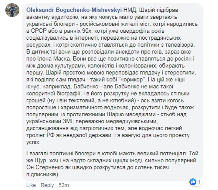 Одночасно користувачі соцмереж відзначили, що Анатолій Шарій зумів зібрати і активізувати вакантну аудиторію, на яку тривалий час не звертали увагу — російськомовних жителів міст, які народилися наприкінці існування СРСР або на початку 90-х.