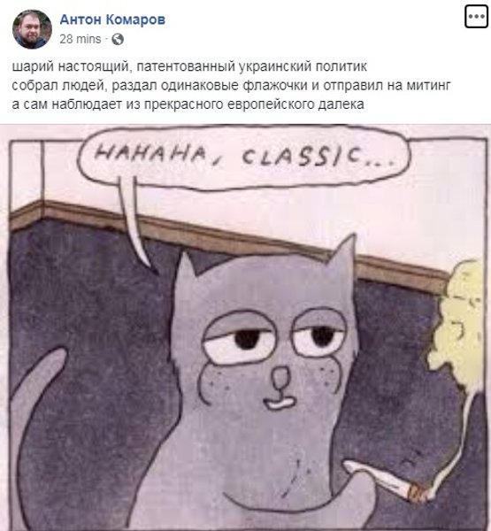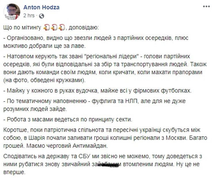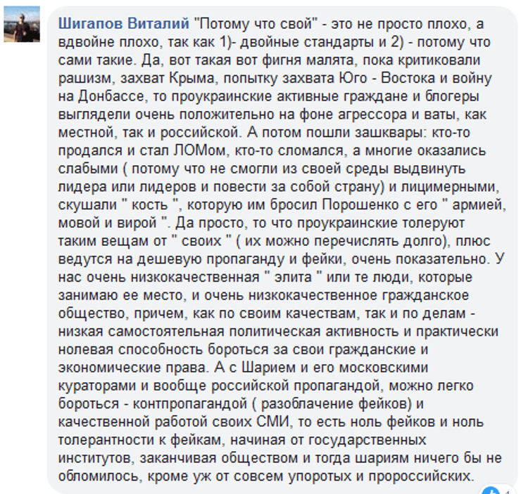 "Після обстрілу "днровцями" із градів маршрутки під Волновахою, він намагався довести, що вибухи спровокував собака (!), Яка вискочила на заміноване поле (!) Біля зупинки маршрутки (!). Іншим разом він виклав відео з офіційного сайту президента Порошенка (ну або аналогічне відео) із класичним рефреном "цього не покажуть українські ЗМІ", хоча ніхто нічого не вирізав. Це тільки ті фейки, з якими я розбирався особисто. З Шаріем все зрозуміло. Але патріотичні лайки вам дорожче", — зазначив блогер.