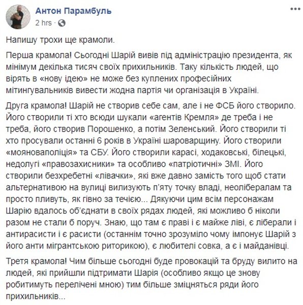 Спровокований Шарієм скандал навколо отримання в 2014 році журналістом Павлом Казаріним російських паспортів (внутрішнього та закордонного), суперечки, викликані "зникненням" із меню терміналу McDonald's російської мови, якого там зроду не було, і, нарешті, досить велика акція протесту під Офісом президента Зеленського, для протидії якої на Банкову прибули активісти націоналістичних та патріотичних організацій С14, Нацкорпуса, "Демократичної Сокири" і "Руху ветеранів України" — всі три інформприводу вклалися менше, ніж за тиждень. Якщо до цього додати скандал із петардою і нападом на співробітників видання sharij.net під судом, де обирали запобіжний захід для Сергія Стерненко, то доведеться констатувати: Анатолій Шарій і його політична сила, яка виросла під парасолькою "журналістської діяльності" найближчим часом нікуди не дінеться, а всі попередні спроби її "знецінити", привели до зворотного ефекту. Фокус спробував розібратися в інформаційному шумі останніх днів і знайти відповідь на питання, чи є спосіб зупинити "проросійський реванш" в Україні.
