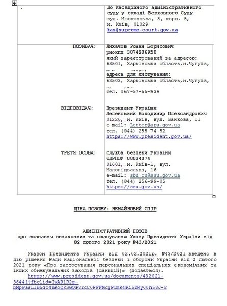 Відповідач у позові — президент України Володимир Зеленський, третьою стороною виступає Служба безпеки України.