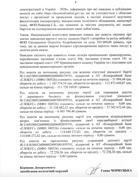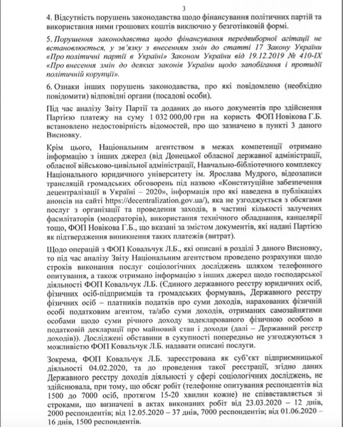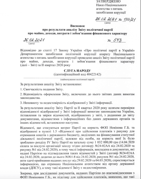 В агентстві вирішили призупинити держфінансування "Слуги народу". Однією з безлічі причин ухвалення такого рішення стало, наприклад, те, що під час вивчення поданих партією документів із взаємовідносин із ФОП Новіковим Г. Б. НАПКА зʼясувало, що вони датовані 18 лютого і 11 березня 2020 року, тобто раніше дати відкриття банківського рахунку (17 березня 2020 року), який вказується в реквізитах цих документів. При цьому гроші в частині здійснення платежів партією переказувалися на інший рахунок, який відкритий на ФОП Новікова Г. Б. в іншому банку.
