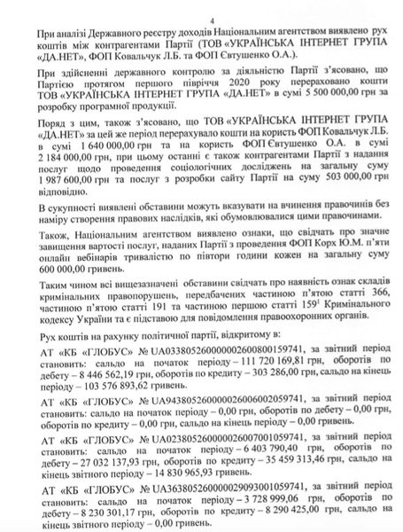 - "Слуга народу" — за ст. 159-1 ("порушення порядку фінансування політичної партії"), ч. 5 ст. 366 ("службова фальсифікація") і ч. 5 ст. 191 ("привласнення, розтрата майна або заволодіння ним шляхом зловживання службовим становищем") Кримінального кодексу;