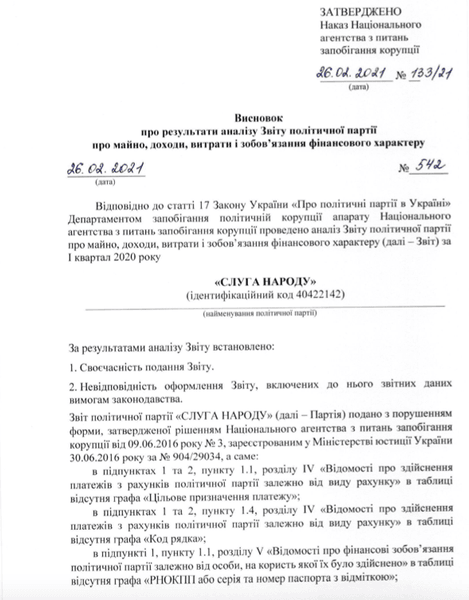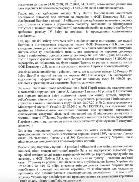 Агентство виявило відсутність звіту міської організації партії міста Українка, відсутність відомостей про наявність фінансових зобовʼязань перед ТОВ "Фінейт" на 45 тис. гривень, підписання видаткових накладних про прийом спонсорських внесків у вигляді листівок, брошур та плакатів особами, які на момент підписання цих документів знаходилися за кордоном і не могли здійснювати юридичні дії з прийому спонсорських внесків (стосується Сумської і Київської обласних організацій), щодо донорів Київської міської організації та Кіровоградської обласної організації виявлено невідповідність доходу донорів і розміру їх внесків на користь цих осередків у 2017-2020 роках, договори з низкою компаній загальною сумою понад 14 млн гривень були датовані раніше, ніж були відкриті зазначені в них банківські рахунки, у чому НАПКА вбачає ознаки порушення ст. 203 Цивільного кодексу (йдеться про витрачання коштів, які партія отримала з держбюджету як компенсацію витрат на парламентську виборчу кампанію).