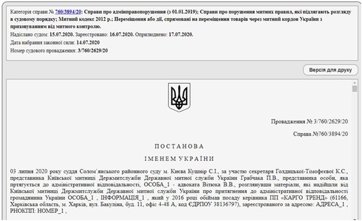 У червні 2020 року в Соломʼянському районному суді Києва розглядалися адміністративні матеріали про порушення митних правил з боку компаній ПП "Карго Тренд", ПП "Тачберг", ПП "Техно Канстракшен", які належать Кучко.