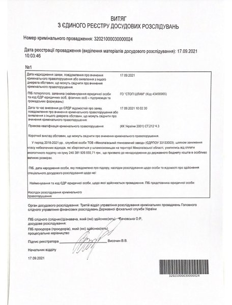Кримінальне провадження відкрито за заявою "СТОП ШЛАМ" — громадської організації, створеної жителями Миколаївської області, які постраждали від негативного впливу відходів виробництва МГЗ — червоного шламу — на їхнє здоров'я. Очікується, що під час досудового розслідування правоохоронні органи з'ясують законність отримання заводом понад 1 млрд гривень щорічно з держбюджету в якості бюджетного відшкодування ПДВ.