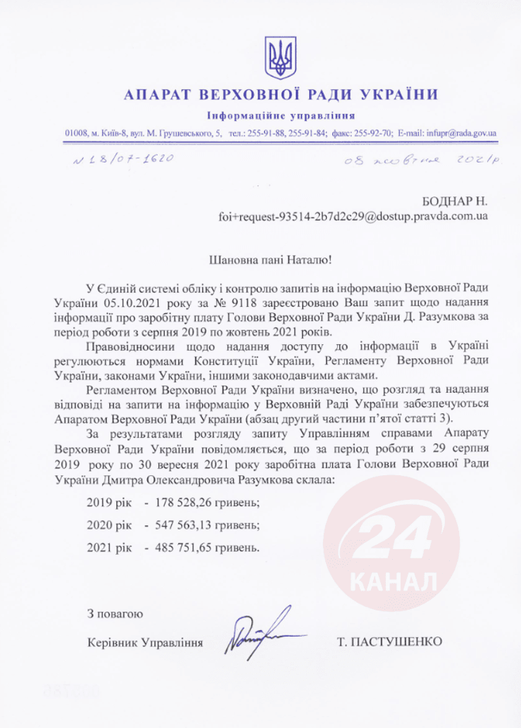 Відомо, що Дмитро Разумков за час перебування у кріслі голови парламенту України з 2019 по 2021 рік заробив 1 211 843 грн.