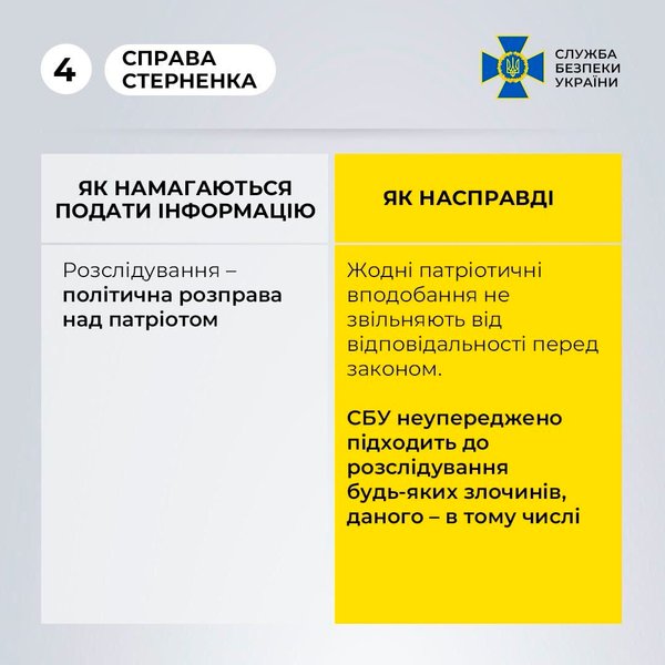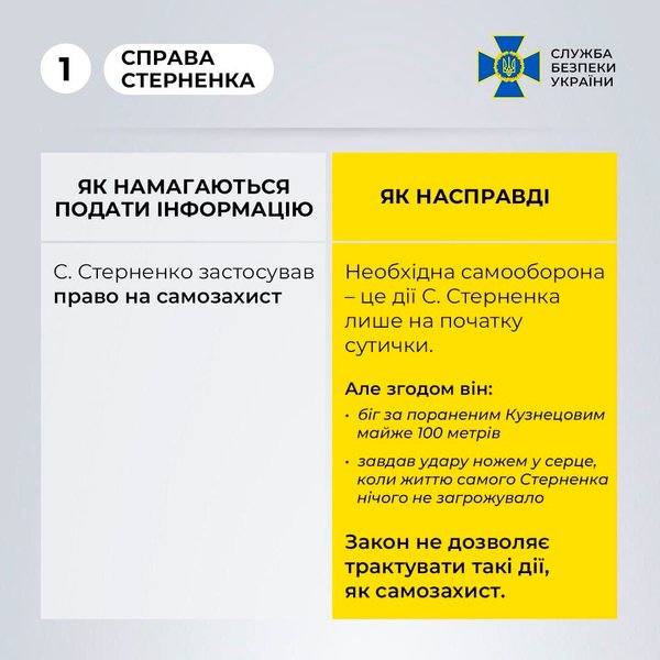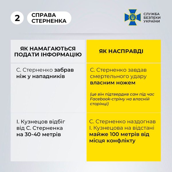 "Сьогодні, враховуючи матеріали справи та проведені експертизи, за погодженням з Офісом Генерального прокурора Сергію Стерненку було повідомлено про підозру в скоєнні злочину за ч. 1 ст. 115 (Умисне вбивство) та ч. 2 ст. 263 (Носіння холодної зброї)… Розслідування "Справи Стерненка" давно перейшла із суто юридичної площини в політико-інформаційну. Тому, враховуючи громадський резонанс, Служба безпеки України зазначає, що неупереджено підходить до розслідування будь-яких злочинів і керується виключно нормами законодавства", — зазначено в коментарі.