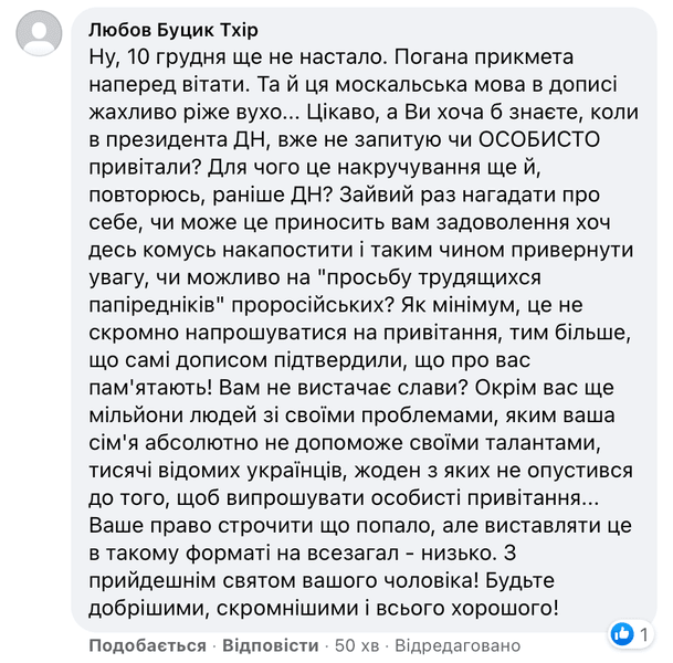 "Ну, 10 грудня ще не настало. Погана прикмета заздалегідь вітати (…) Як мінімум, це не скромно напрошуватися на привітання, тим більше, що власне повідомленням підтвердили, що про вас пам'ятають! Вам не вистачає слави? Крім вас, ще мільйони людей зі своїми проблемами, яким ваша сім'я абсолютно не допоможе своїми талантами, тисячі відомих українців, жоден з яких не опустився до того, щоб випрошувати особисті вітання…" — вважає інша користувачка мережі.