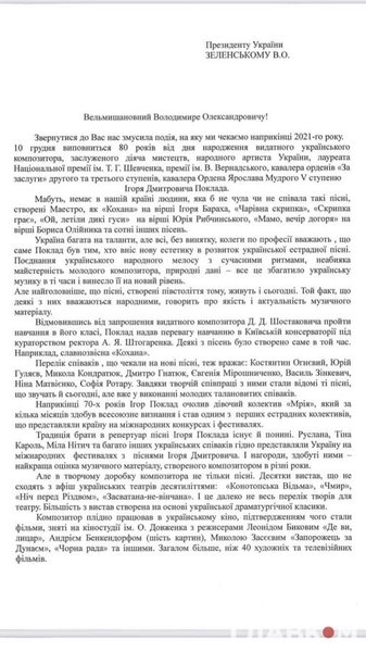 Дружина відомого українського композитора Ігоря Поклада, Світлана Поклад, розкритикувала президента Володимира Зеленського через те, що, за її словами, Офіс президента вирішив надіслати вітання від імені глави держави народному артисту з 80-річчям через Viber. Жінку обурило, що в представництві українського лідера її попросили самостійно роздрукувати листа. Про це вона написала у своєму Facebook.
