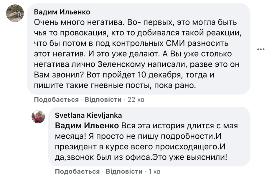 "Ви вже стільки негативу особисто Зеленському написали, хіба це він Вам дзвонив? Ось пройде 10 грудня, тоді й пишіть такі гнівні дописи, доки рано", — вважає один із коментаторів.