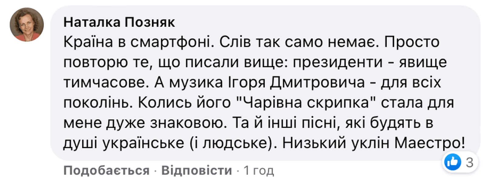 "Країна у смартфоні. Просто слів немає. Просто повторю те, що писали вище: президенти — тимчасове явище. А музика Ігоря Дмитровича — для всіх поколінь. Колись його "Чарівна скрипка" стала для мене дуже знаковою. Та й інші пісні, які пробуджують у душі українське та людське. Низький уклін Маестро!" — йдеться в одному із коментарів.